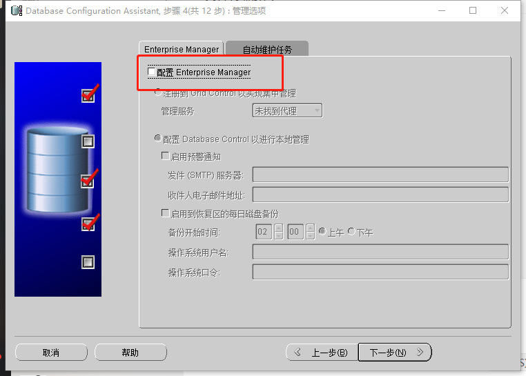 e.取消“配置Enterprise Manager"勾选,点击“下一步”