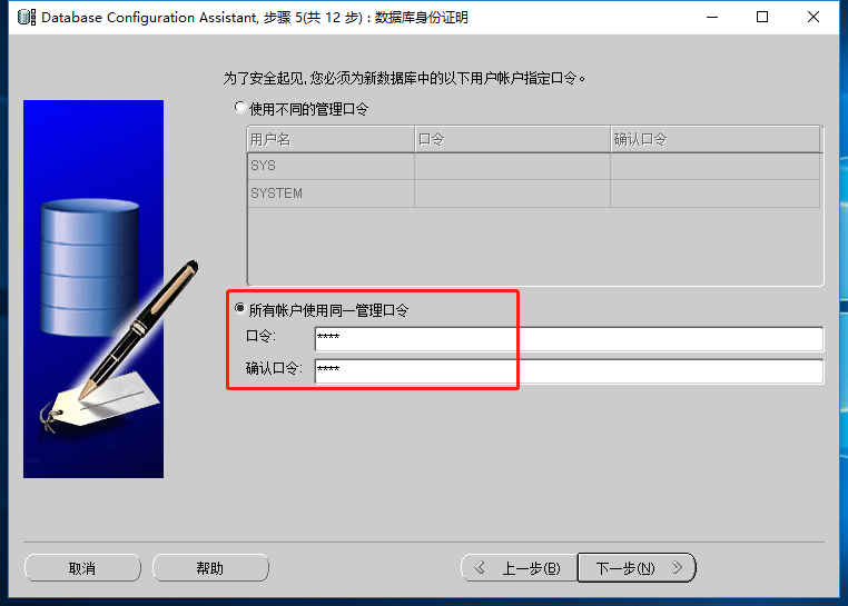 f.选择”所有账户使用同一管理口令“,输入口令(即数据库用户sys,system的密码。oracle数据库有很多用户,sys、system是数据库的管理员,权限最大)