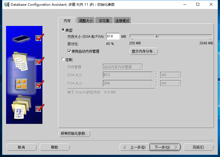 12、方案口令:选择”对所有账户使用相同的口令“设置为oracleadmin。口令不标准,没关系