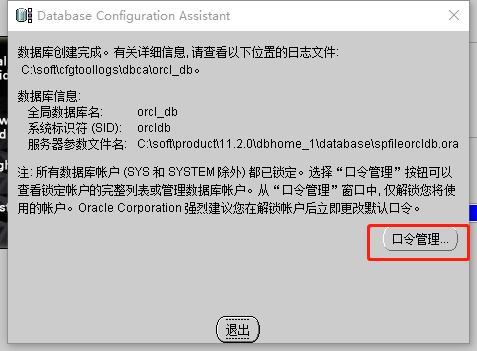 14、安装产品:安装完成以后,会自动跳到一个界面”database configuration asssistant“,需要对这界面进行配置,选择”口令管理“,设置 "超级管理员:sys/change_on_install