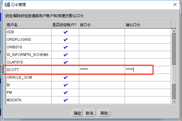 p.,找到下图SCOTT用户,取消”锁定账户“,输入”新口令“和“确认口令”,点击“确认”,完成数据库的配置