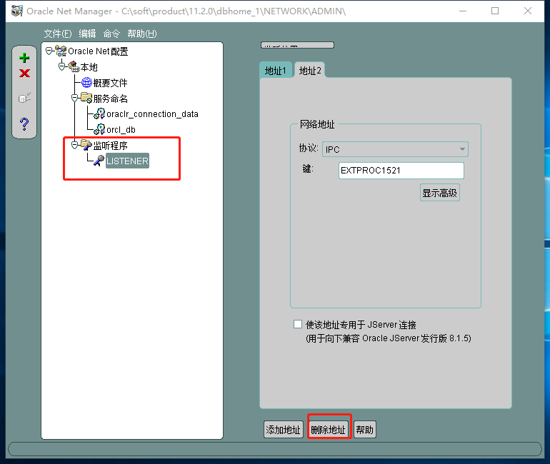 j.点击“监听程序”,打开LISTENER,也就是第4步配置的监听程序,点击右下角的“删除地址”,将原本存在的两个地址都删除掉,删除完成后,再点击“添加地址”,新添加的内容不要修改,退出并保存。