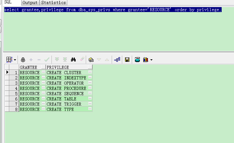 select grantee,privilege from dba_sys_privs where grantee='RESOURCE' order by privilege; select grantee,privilege from dba_sys_privs where grantee='CONNECT' order by privilege; select grantee,privilege from dba_sys_privs where grantee='DBA' order by privilege;