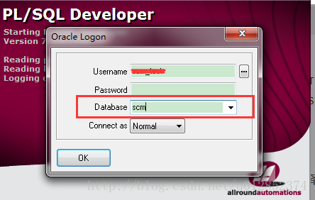 再打开pl/sql客户端,Database选项选择刚才配置的scm,输入用户名和密码即可。如图: