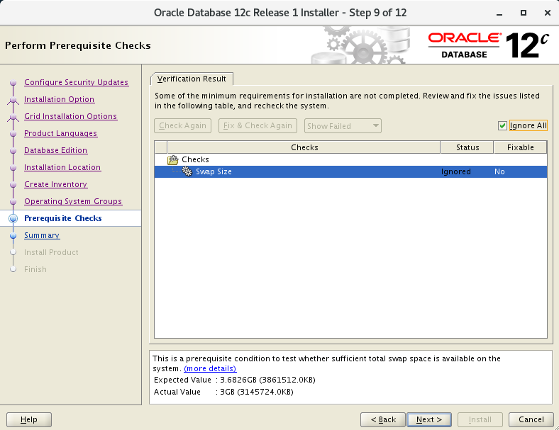 检查先决条件,如果有不通过的会显示在上面,因为是实验环境swap空间直接忽略就行