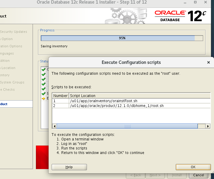 如果出现如图情况,先不要着急的点OK,需要用 root 用户执行如图提示的两条命令,执行完后再点OK
