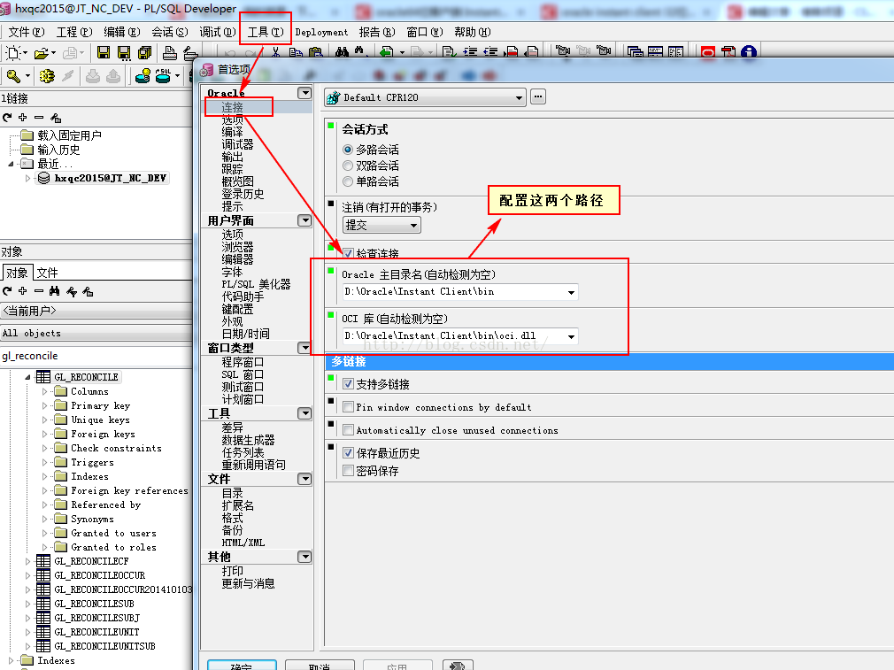第三步:配置plsql ——工具——连接配置oracle 主目录名路径和coi 库路径