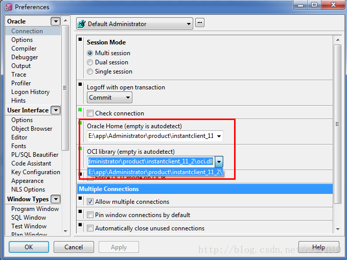 4. 打开PLSQL Developer,选择Tools -> perference -> Connection,配置其中的Oracle Home和OCI Library项,如下图所示: