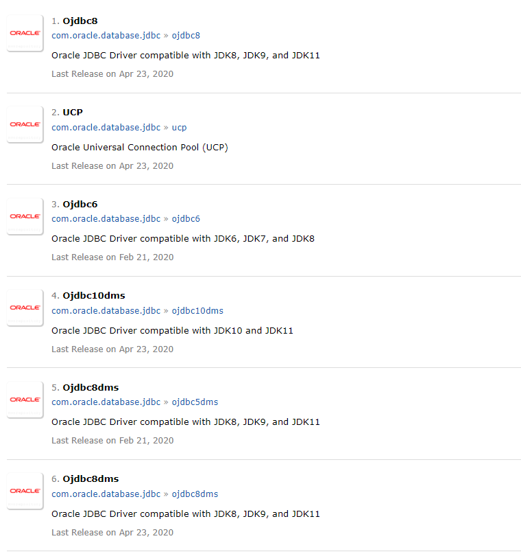 <dependency> <groupId>com.oracle.database.jdbc</groupId> <artifactId>ojdbc10</artifactId> <version>19.6.0.0</version> </dependency>