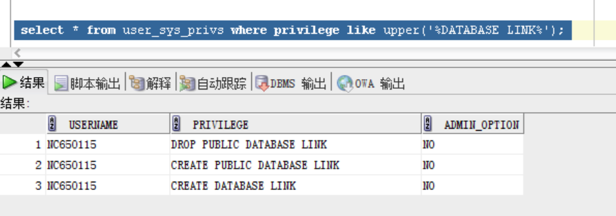 2.先在nc650115查看是否拥有创建dblink权限。在nc650115中执行