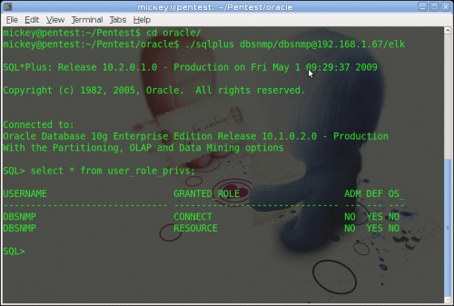 我的渗透环境用的是 ubuntu8.10+metasploit 3.3 dev,oracle 数据库版本为 10.2.0.1.0,服务启动权限为 administrator,数据库账户用的是 dbsnmp 账户的默认权限.