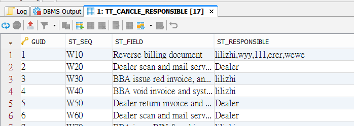 select * from ( select guid, regexp_substr(st_responsible, ‘[^,]+‘, 1, level) responsible from tt_cancle_responsible connect by level <= regexp_count(st_responsible, ‘,‘) + 1 and guid = prior guid and prior dbms_random.value is not null ) where responsible =‘wyy‘;