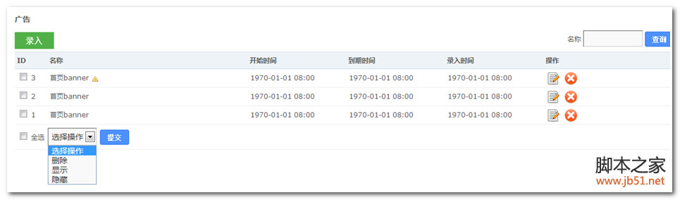 实现功能,操作项可以单独删除,批量项可以批量删除,批量显示,隐藏(改广告的数据库的status_is的值);