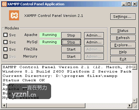 我使用的是 XAMPP 的 Windows 版的安装包,下载后直接安装即可,安装过程所有选项保持默认即可。建议不要直接装在 C 盘。安装过程结束后,您会在 开始/程序/XAMPP 菜单下找到 XAMPP。您可以使用 XAMPP 控制面板来启动/停止所有服务或安装/卸载所有服务。