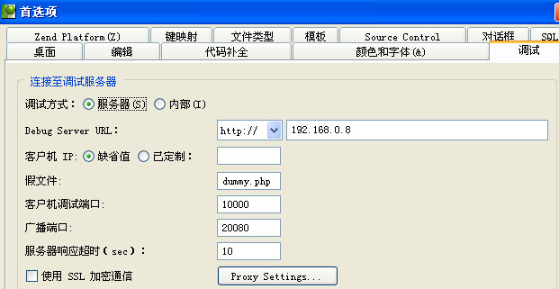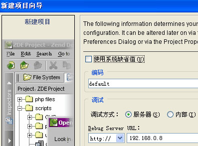 三、 开始调试从“开始菜单”找到“Zend Development Environment(Zend Studio)”并运行它。新建一个项目,并在这个项目中引入一个开发好的源码包,我这里的源码包在“D:\soft\PHP\htdocs\cms”,这cms是SupeSite7.0程序,在新建项目的调试选项里设置成像下图,其中Debug Server URL也可以是127.0.0.1这样的地址,只要几处设置同步就行: