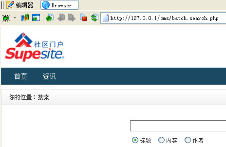 打开SupeSite7.0源码项目,选择Zend Studio内置浏览器,并在地址栏里输入:http://127.0.0.1/cms/ batch.search.php,这里我演示SupeSite7.0的搜索页代码调试。现在你直接按浏览器最左边的“介壳虫”按钮(从旁边倒三角可以选择不同的调试范围),直接进入batch.search.php页面调试(如果batch.search.php页之前不在编辑状态,即没有打开过,直接调试会自动打开,另外如果你用F11逐语句执行的话,当前调试页包含的外部代码文件也会被打开。