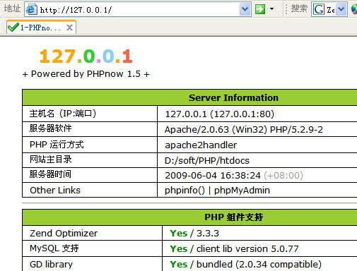 二、 配置程序1、安装PHPnow。把安装包PHPnow-1.5.3.zip解压到一个地方,像我这里解压到“D:\soft\PHP”,然后双击PHP文件夹中的“Setup.cmd”开始安装,中间安装到MySql的时候会提示你输入数据库用户名和密码,本地测试用一般就都设为“root”。安装完成后在浏览器输入以下地址http://127.0.0.1/,如果成功的话,你将会看到如下画面: