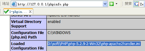 现在去PHP安装目录修改PHP配置文件,这个文件通常被命名为“php.ini”,让服务器能正确加载我们的模块。但是这个PHPnow环境下的PHP配置文件不叫“php.ini”,而是“php-apache2handler.ini”,我们怎么可以知道当前WEB服务器所用PHP的配置文件名呢。下面就是一个办法:在“D:\soft\PHP\htdocs”目录,建立一个phpinfo.php文件,并在其中输入内容“<?php echo phpinfo(); ?>”,然后打开浏览器可以看到如下信息,反白显示路径就是当前PHP配置文件所在路径了:
