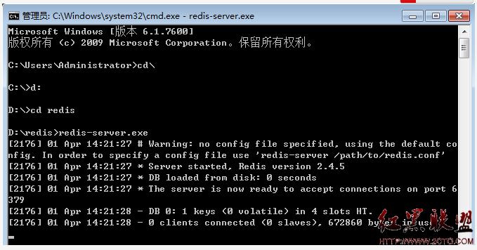打开一个cmd窗口 使用cd命令切换目录到D:\redis 运行 redis-server.exe redis.conf