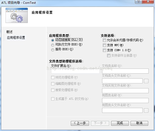 2、到了ATL项目向导,不需要改动,完成向导。向导完成后,vc将会自动生成一系列的程序。