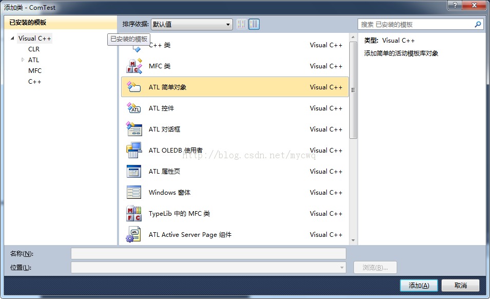 3、切换到类视图,在ComTest项右键,添加类,选择ATL简单对象,