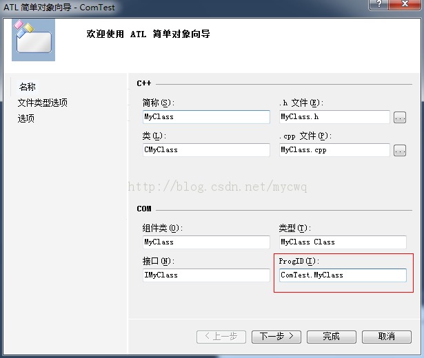 4、来到ATL简单对象向导,输入你要新建的类名 MyClass,完成向导。(注意了,还要填写ProgID,有些vs会自动补全)