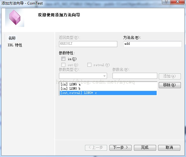 6、来到添加方法向导,我们想实现计算2个数相加的功能,如下,参数a和b都是[in] Long,c为COM返回参数,为[out, retval] Long*,是一个指针。完成向导。