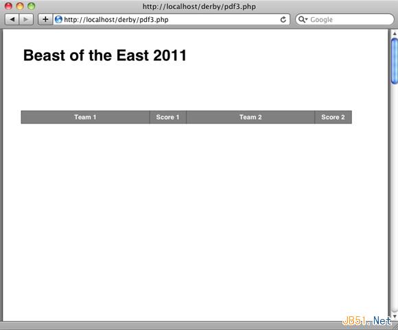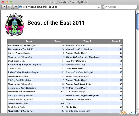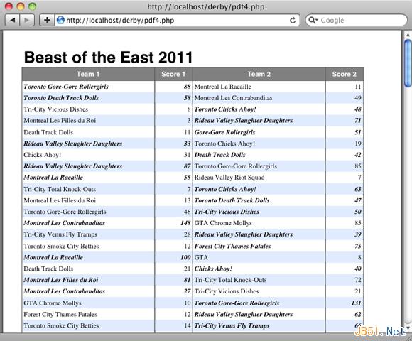 $fill 变量可通过切换来改变表中每行的颜色。优胜队的名称和得分用加粗、斜体字体表示,这样可以清晰显示它们。还需注意的是,字体从标题的 Arial 字体更改成了显示比赛内容所用的 Times 字体。