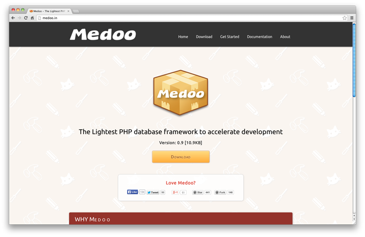 Medoo 是最轻的 PHP 数据库,只包括了一个10,9kb 的文件,一个很强大的适用于简单的 web 小应用开发的微型框架。