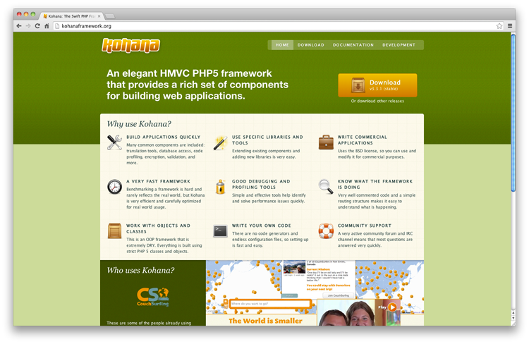 这个框架源于 Kohana 框架,是我最喜欢的框架了:兼容 MVC,能快速掌握,强大,你也应该试一试!