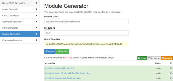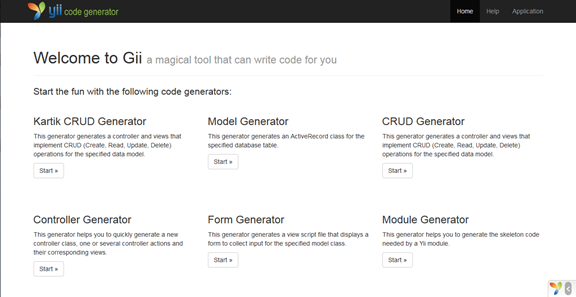 yii2框架提供的生成工具有6个:Model,CRUD,Controller,Form,Module,Extension