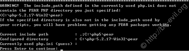 6、安装的时候脚本会提示你设定 php.ini 的里面 include_path,我们按照要求在 php.ini 里面设置好,设置好后回车即可