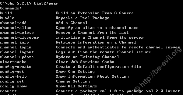 8、输入回车,pear 的安装就完成了, 测试 pear 是否装好,可以直接在命令行输入 pear,如果你看到下列的输出,那就是 ok 了