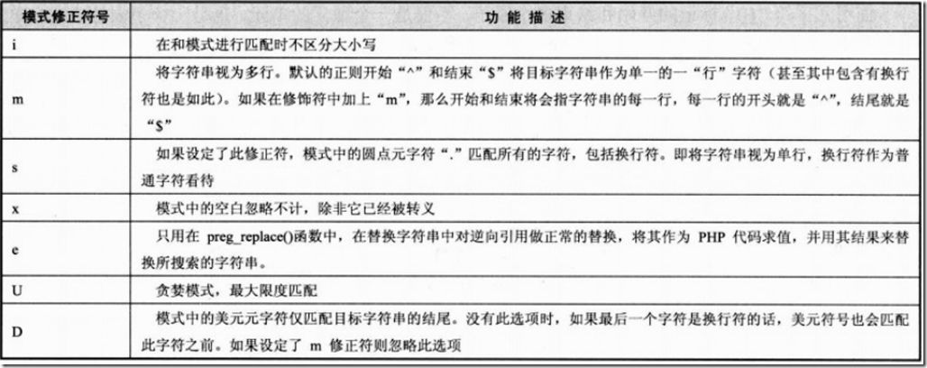 1.4 模式修正符:在正则的定界符之外使用,扩展正则在匹配、替换等方面的功能。