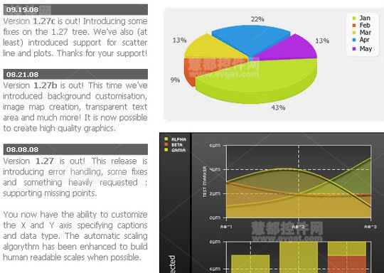 pchart是一个开源的图表生成库,主要涉及3个Class:pChart.class, pData.class, pCache.class,可生成20多种简单或复杂的图表,支持PNG,JPG,GIF通用图片格式。