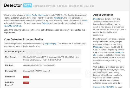 Detector是一个开源的PHP类库,用于检测关于用户浏览器环境的许多东西,同时它可以获得浏览器的使用和浏览器的html5、css3功能。类库可以自动适应新的浏览器版本和设备,对每一个浏览器使用独特的用户代理字符。