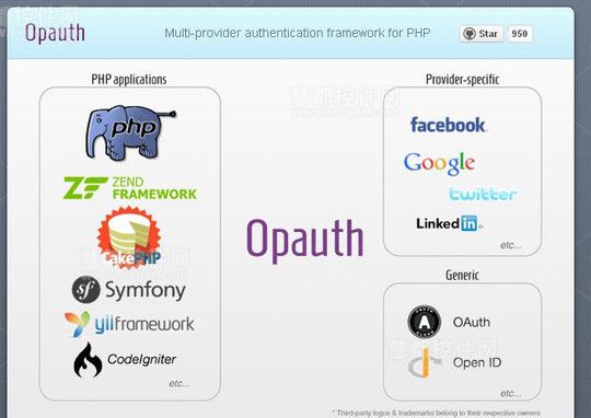 Opauth是一个开源的PHP类库,它消除了Provider之间的不一致,提供一个标准的方法来对他们进行处理。Opauth除了支持Google、Twitter 和Facebook之外,还支持任意Oauth provider。此外,它还能够与一些常用的PHP开发框架相集成使用,包括:CakePHP,Yii等。