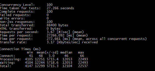 我的测试模拟的是然后开始100个并发, 100个请求的ab压测