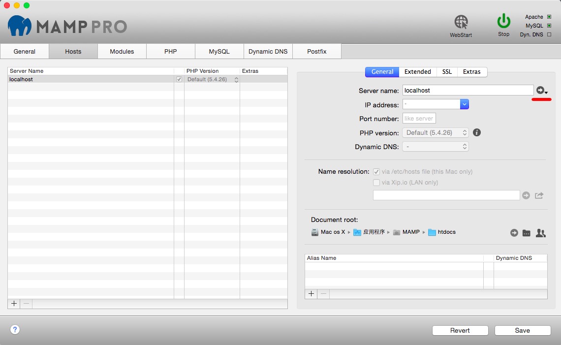 在Mac系统,我们可以使用MAMP Pro 软件来搭建本地服务器。安装好这款软件,网站的目录在 /Applications/MAMP/htdocs 文件夹里,只需将文件放入该文件夹中,就可以通过http://localhost:8888来访问了,或者通过点击如下红色下划线按钮来快速访问站点。