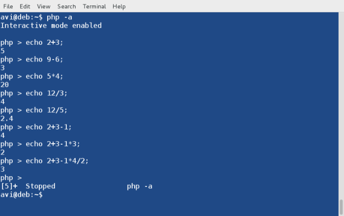 3. 以交互模式运行PHP并做一些数学运算。这里,‘-a‘ 选项用于以交互模式运行PHP。