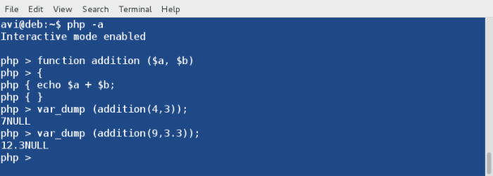 你可以一直运行该函数,直至退出交互模式(ctrl+z)。同时,你也应该注意到了,上面输出结果中返回的数据类型为 NULL。这个问题可以通过要求 php 交互 shell用 return 代替 echo 返回结果来修复。