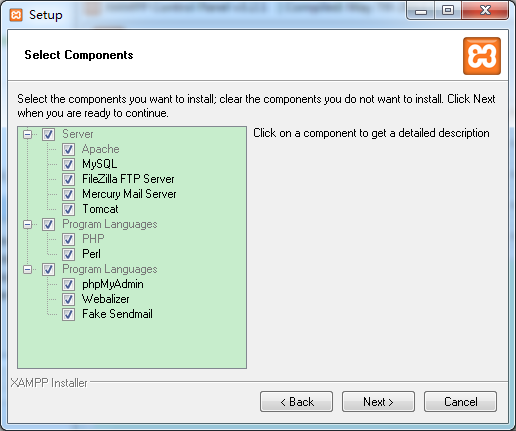 安装选项,初学者简单点,全部选上就可以了,这些tomcat、mysql全部安装在xampp的目录下,不会对自己的原有tomcat、mysql搞混的,不使用它们就行了。