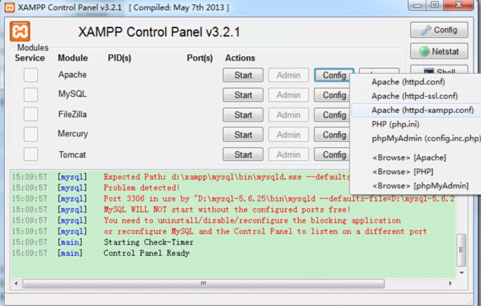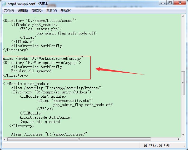 安装成功之后,运行xampp\xampp-control.exe,在Apache那一行,点击Config,会弹出下拉框,选第三个Apache(httpd-xmapp.conf),然后插入如图的一段配置,第一句是给这个PHP工程设置一个别名,方便在浏览器的地址栏访问,下面的是指定PHP工程的位置。保存一下。