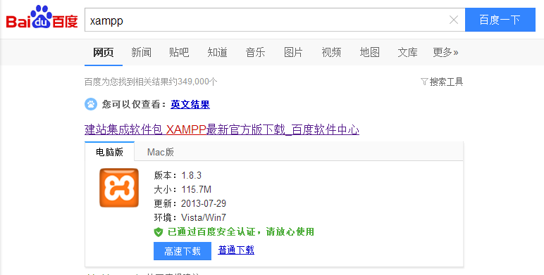 百度搜索xampp,在第一个结果,点击普通下载。