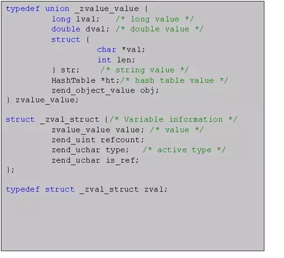 Zval是zend中另一个非常重要的数据结构,用来标识并实现PHP变量,其数据结构如下: