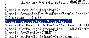 把 $jsapi->SetTimeStamp($timeStamp);