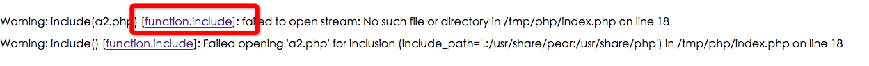 //Warning: include(): Failed opening 'a.php' for inclusion (include_path='.:/usr/share/pear:/usr/share/php') in /tmp/php/index.php on line 7