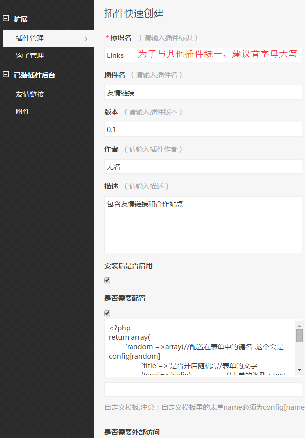 这里的钩子我新建了一个indexFooter,因为我只需在前台首页底部显示友情链接即可。我们把上面所有要勾的地方都勾上,至于有什么区别,大家可以自己建几个例子区分一下,生成的文件是否一样。OK!到这里 我们的友情链接插件就创建好了!点击“确定”。(这里的自定义模板什么的,通通不填,我会在下篇文章演示添加自定义模板的效果)