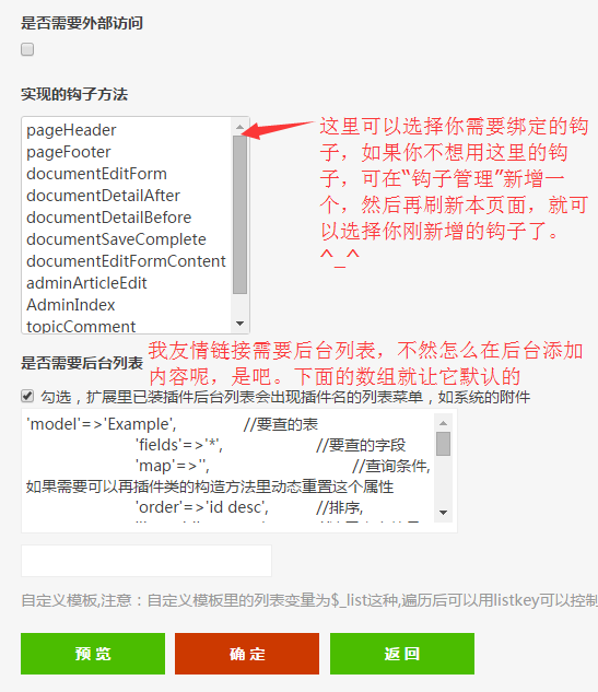 这里要显示具体类型、显示图片等,需要自定义adminlist.html模板了。关于自定义模板,我们下一篇文章再说。关于钩子,其实就是写一个函数从数据库读取数据,然后在前台需要的地方调用钩子就行。如果需要模板,则在钩子函数里解析模板。钩子调用格式一般: