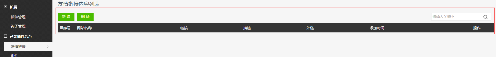 好了,到这里就差不多了,保存一下LinksAddon.class.php 文件,应该可以正常显示了,我们来看看。进入插件列表,先把Links插件卸载,然后重新安装。点击左侧菜单“友情链接”,可以看到